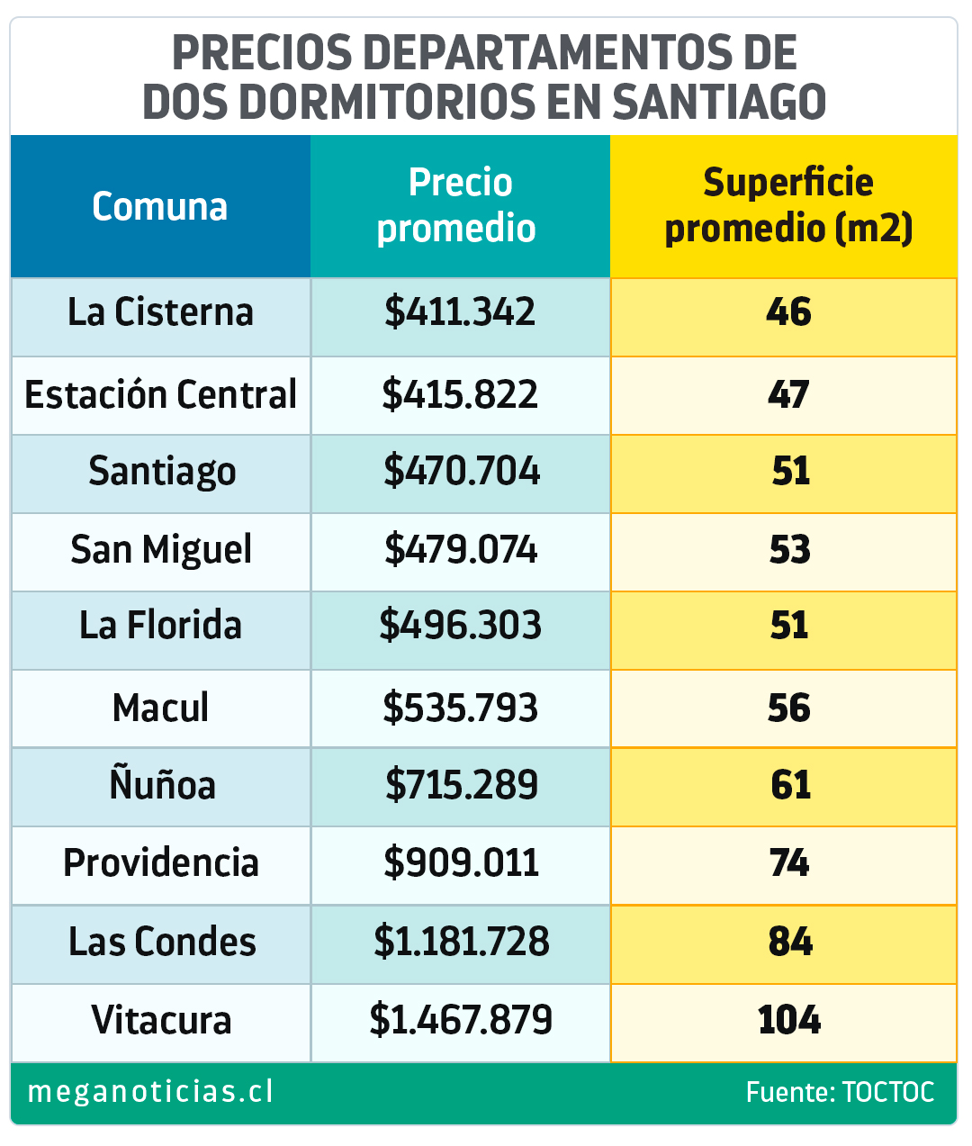 El precio de los arriendos y de las viviendas en general ha ido al alza durante los últimos meses debido a factores como la inflación. Un reporte de la plataforma de gestión inmobiliaria TOCTOC reveló que el 40% de las personas que pretende alquilar un departamento, dentro de la Región Metropolitana, buscan inmuebles de dos dormitorios.