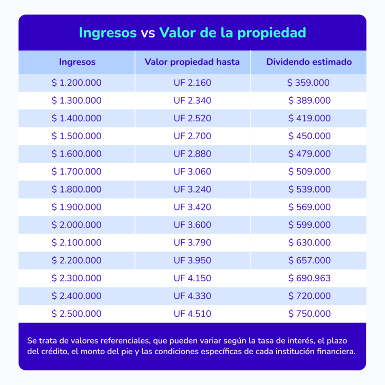 La siguiente tabla muestra una estimación del valor máximo de la propiedad que podría financiarse según distintos niveles de ingreso mensual, junto con el dividendo aproximado asociado a cada escenario.