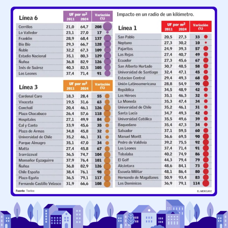 El análisis, que abarcó el periodo 2011-2024, muestra que las viviendas situadas a menos de un kilómetro de las Líneas 3 y 6 experimentaron alzas promedio de 81% y 113% respectivamente, superando con creces el incremento general del mercado inmobiliario (48%).